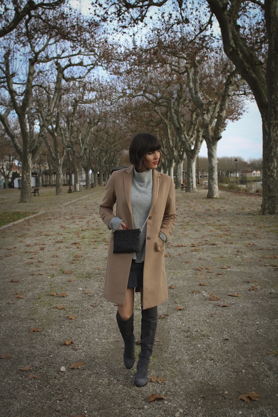 Manteau long Uniqlo et cuissardes grises Sacha Shoes