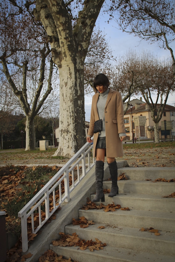 Manteau long Uniqlo et cuissardes grises Sacha Shoes
