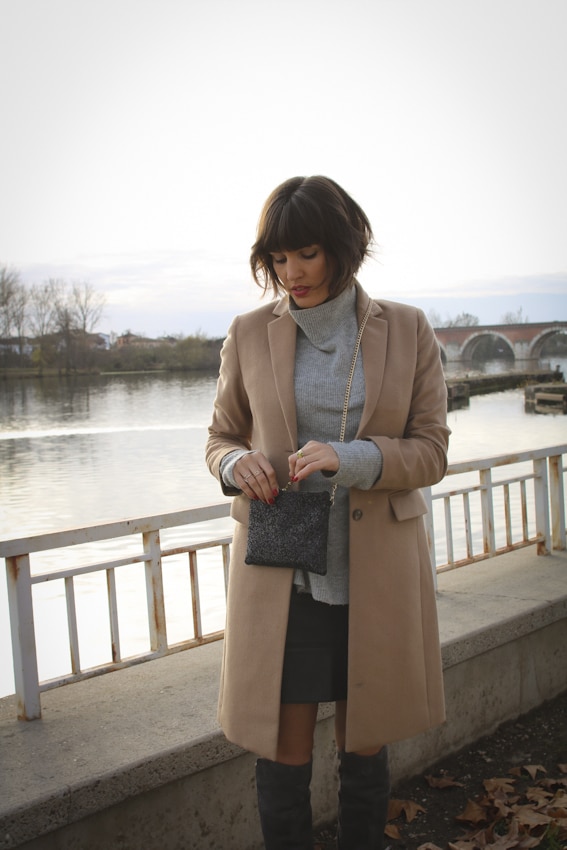 Manteau long Uniqlo et cuissardes grises Sacha Shoes